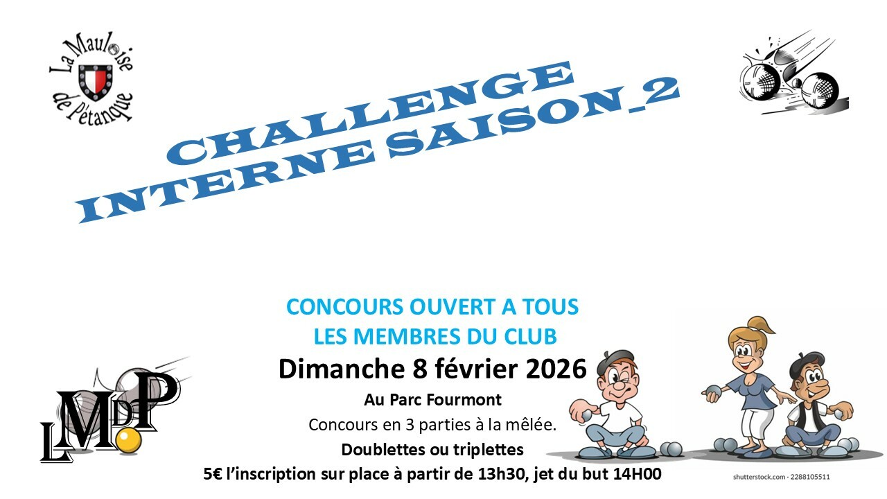 Nous lançons les inscriptions du challenge saison_2, concours_2, qui aura lieu le dimanche 8 fevrier 2026 au parc Fourmont qui est ouvert à tous les membres du club et se déroulera à la mêlée en 3 parties.